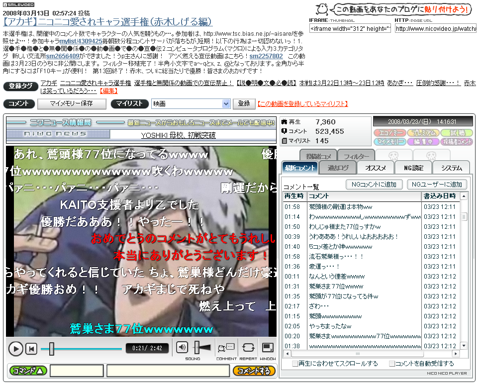 やったぁ! 夜応援できたからよかった! そして鷲巣様はまたしても奇跡の77位で次回のラッキーシード枠をGET! なんて剛運(笑) ってよく見たら「死ね」とか書かれてた>< キャプチャ失敗w でも優勝うれしいからいいや!